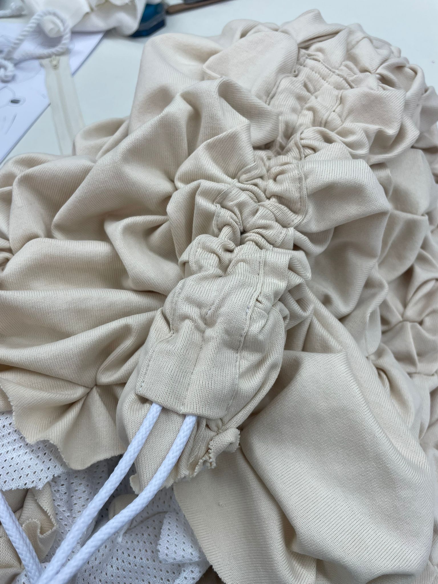 I began by researching and comparing different fabrics such as cotton, linen, recycled knit, and woven net. This helped me understand how materials and production methods influence texture, comfort, durability, and sustainability. I decided to work mainly with knit fabrics because they adapt better to the body and provide elasticity and versatility. During the construction process, I realized the garment could not function without fastenings, so I added them and made small adjustments. Another challenge was the weight of the garment, which turned out heavier than expected. I also added drawstrings so the piece could adapt better to different body areas and be worn in different ways. One of the most important outcomes was creating a garment that can be worn in three different ways, increasing its versatility and lifespan. Throughout the process, I focused on using natural materials, manual production, and designing a unique piece adaptable to different body types.