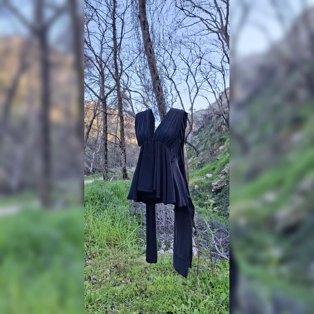 My project started with research on textile waste, excess stock, and the way basic garments are overproduced and undervalued. From there, I developed the concept of “The many faces of Artemis” and connected it to Greek and Roman mythology, focusing on the three feminine identities of Artemis, Selene, and Hecate. I gathered old black T-shirts and tank tops and studied how their stretch, drape, and faded surfaces could be reused in a new form. The biggest challenge was to create a garment that felt intentional and refined while using soft jersey pieces that originally belonged to different items. I also had to work around the limits of the materials, since my available resources were a cotton/poly blend rather than the all-cotton option I had first imagined. Instead of hiding those limitations, I used them to guide the final silhouette and construction. The result was an adjustable, multiuse mini dress inspired by Greco-Roman hunting robes, built through experimentation, draping, and sewing. Through the process, I understood even more clearly that waste materials can become the starting point for strong storytelling and design.