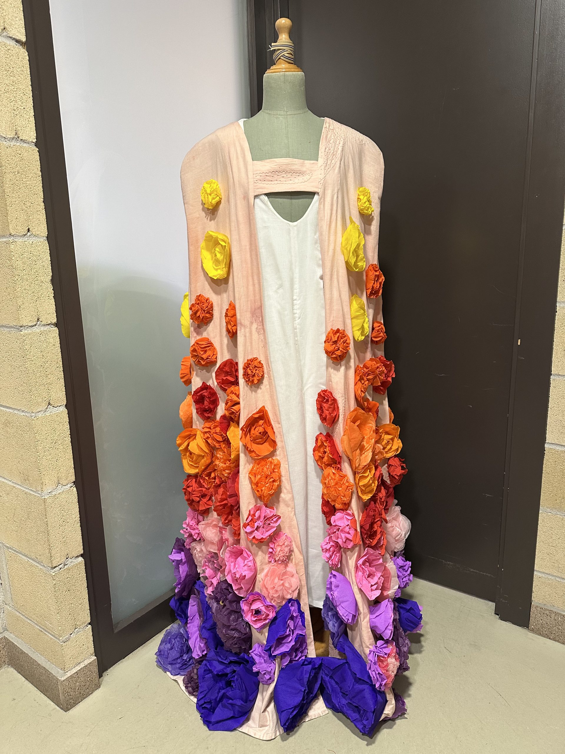 The biggest challenge was to handle the fabric for the cape and dress, as they are very large patterns and the fabric was what I had available. For this look, I used sheets. To do this, I had to put some pieces double instead of single. At first, I made the flowers with reused clothing, but the visual result was not what I expected. The solution was to remove them and look for a new technique with new materials and I found paper was better.