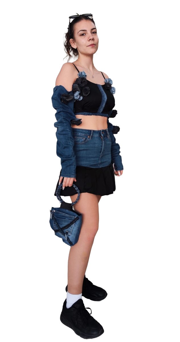 Working with recycled fabrics required extra attention. Some parts had to be carefully combined. This was a challenge, but it helped us develop our skills. From the leftover fabric pieces, we created decorative roses, which we applied as embellishments on the blouse.