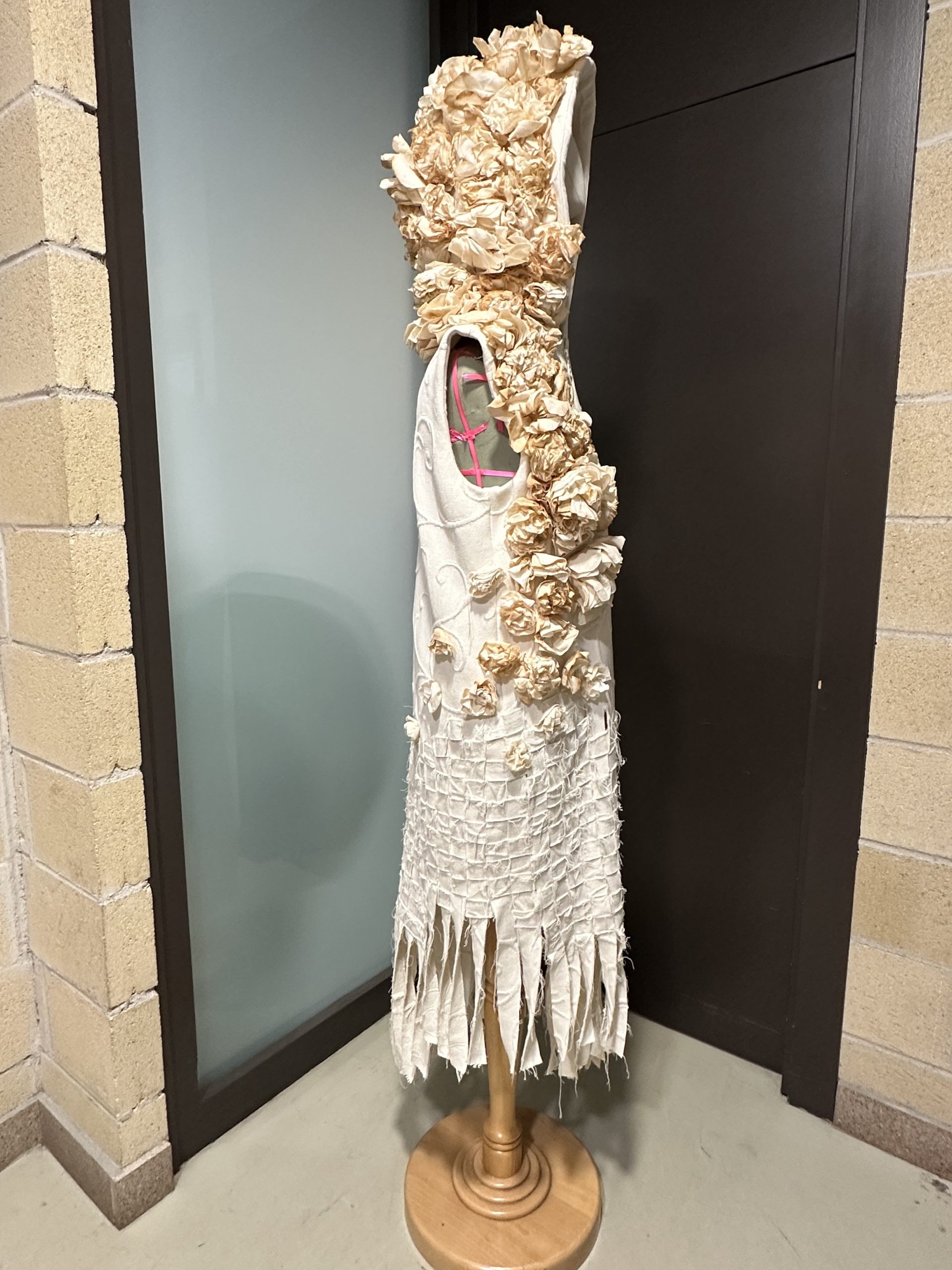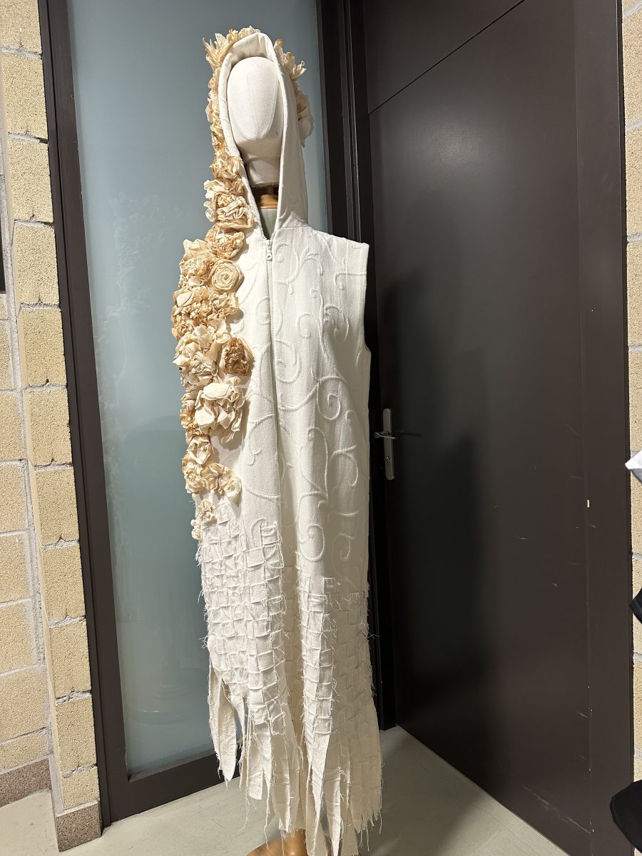 It has been a very enjoyable process because my original idea could be maintained through the different stages. I wanted to reuse a bed cover and I totally transformed it into a dress. The bottom part of it, with the fabric cut into stripes and woven in a square pattern was challenging but the result is very good. The ornamental flowers were made with unused and out-of-date Covid masks filters.